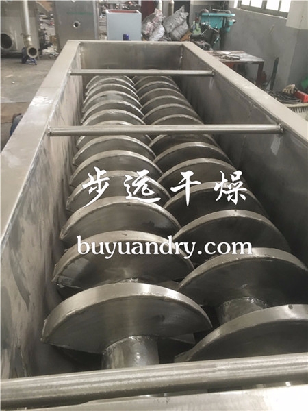 空心轴上密集排列着楔型中空浆叶,热介质经空心轴流经浆叶。单位有效容积内传热面积很大,热介质温度从-40℃到320℃,可以是水蒸汽,也可以是液体型:如热水、导热油等。间接传导加热,没有携带空气带走热量,热量均用来加热物料。热量损失仅为通过器体保温层向环境的散热。楔型浆叶传热面具有自清洁功能。物料颗粒与楔型面的相对运动产生洗刷作用,能够洗刷掉楔型面上附着物料,使运转中一直保持着清洁的传热面。浆叶干燥机的壳体为Ω型,壳体内一般安排二到四根空心搅拌轴。壳体有密封端盖与上盖,防止物料粉尘外泄而充分发挥作用。
